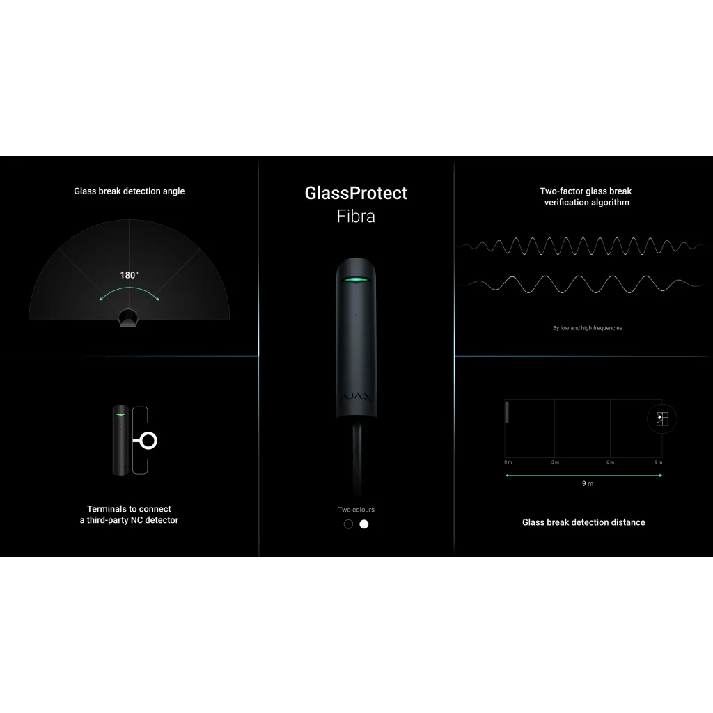 L'Ajax GlassProtect Fibra est un détecteur de bris de verre pour bus. Conçu pour une utilisation en intérieur. Il prend en charge la connexion d'un détecteur normalement fermé d'un tiers. La portée de la connexion câblée peut atteindre 2000 mètres lorsqu'elle est connectée via une paire torsadée U/UTP cat.5.