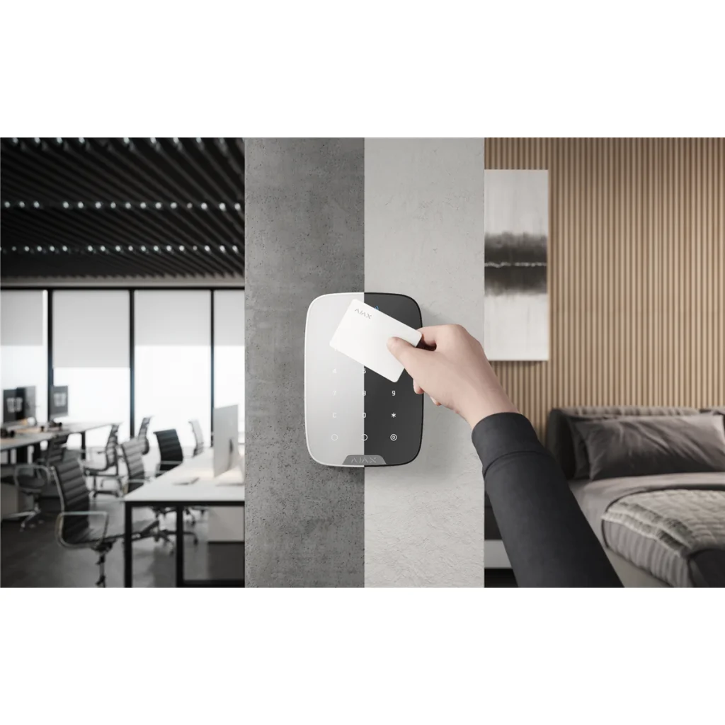 Cette carte protégée contre la copie permet de gérer les modes de sécurité sans mot de passe, sans compte d'utilisateur et sans accès à l'application Ajax. Pour désarmer le système de sécurité, il suffit de tenir le pass contre le lecteur du pavé numérique.