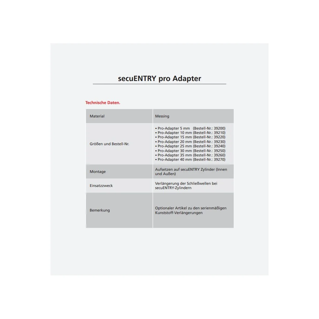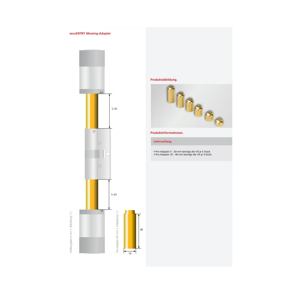 L'adaptateur secuENTRY Pro de BURG-WÄCHTER est une extension en laiton pour l'intérieur et l'extérieur qui remplace les extensions standard en plastique pour les cylindres de verrouillage électroniques secuENTRY pro. Les adaptateurs secuENTRY pro en laiton sont disponibles en huit longueurs différentes : de 5 à 40 millimètres, par incréments de cinq millimètres. Ces adaptateurs améliorent encore les cylindres de porte haut de gamme et leur donnent une belle apparence. Les entretoises conviennent à tous les cylindres de porte secuENTRY pro qui utilisent des extensions d'arbre de verrouillage en plastique.